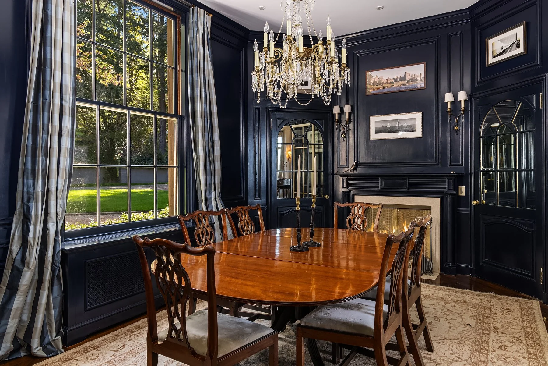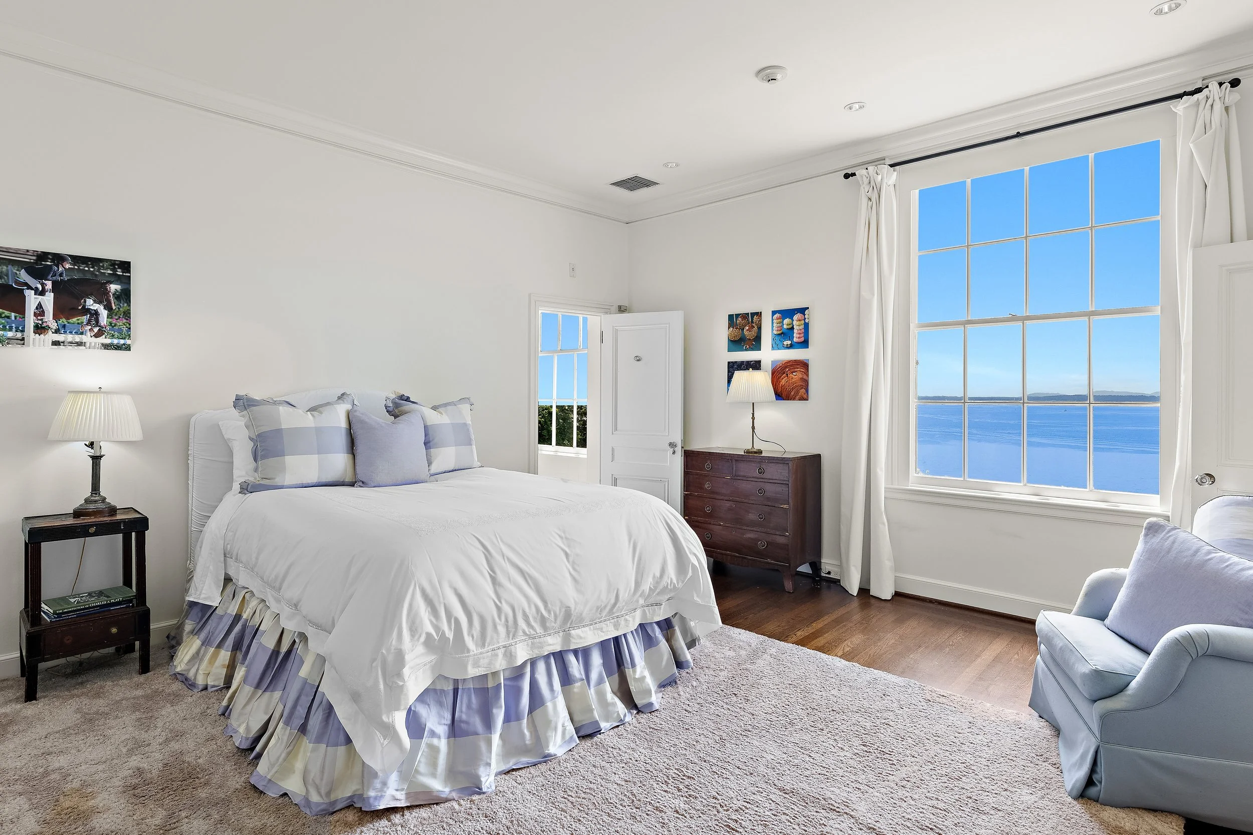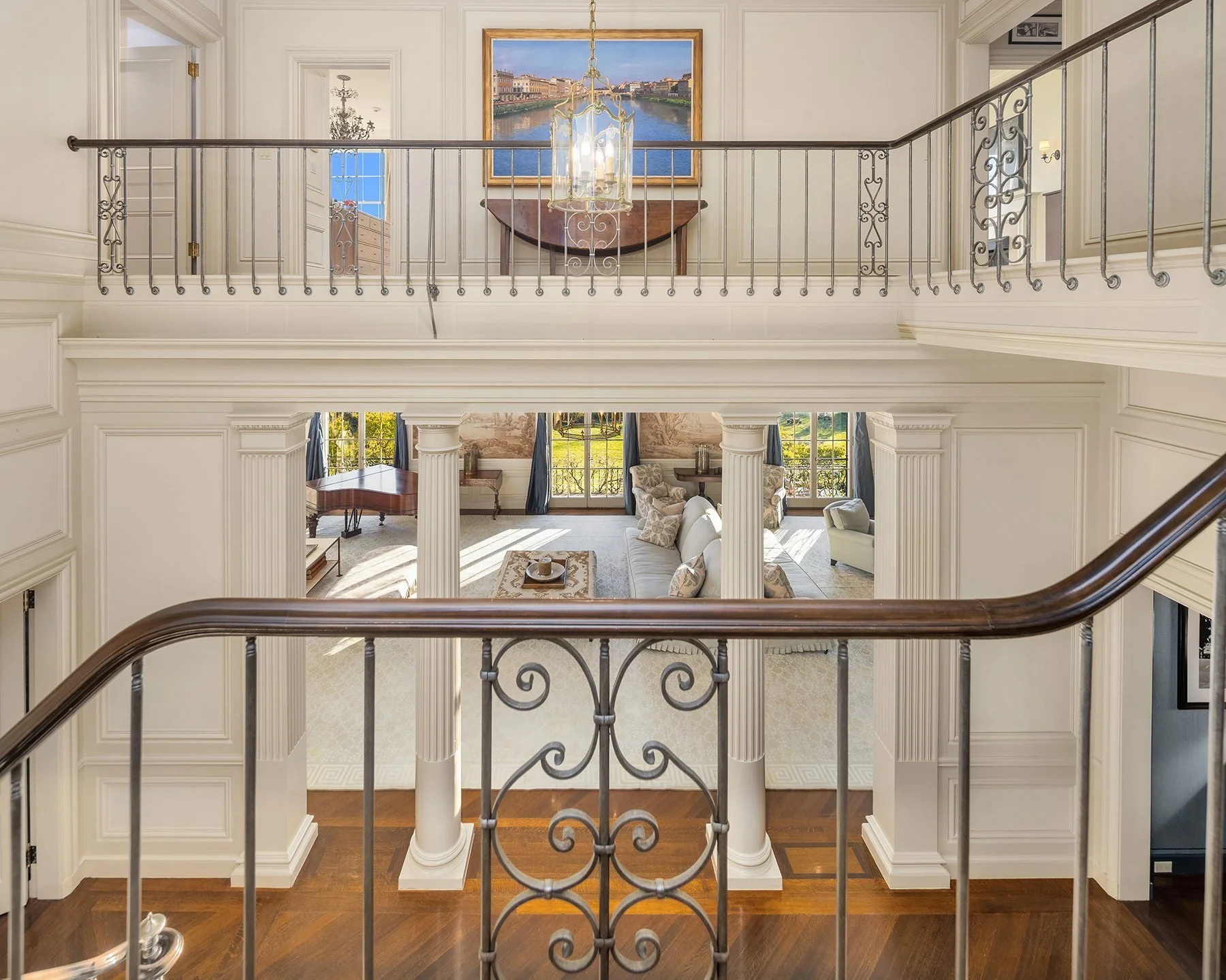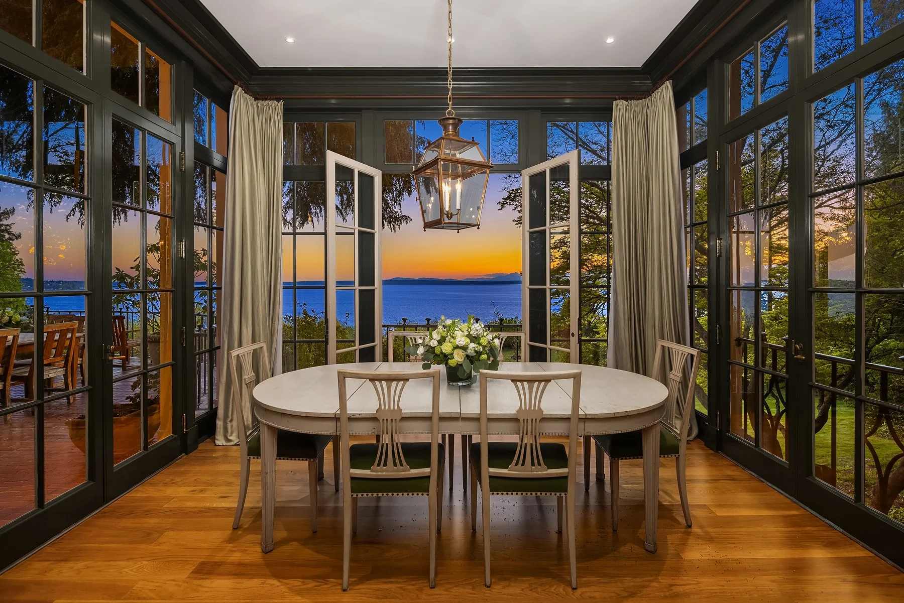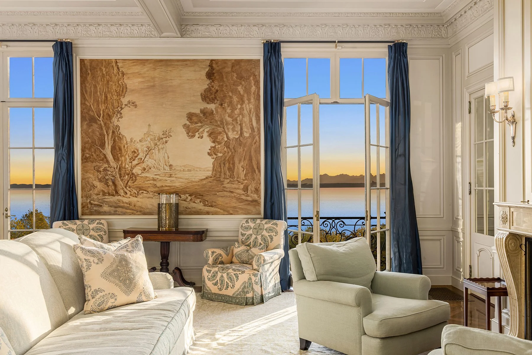 The home unfolds with quiet drama. A grand, mural-adorned drawing room, paneled library, and formal dining room all frame panoramic views of Puget Sound and the Olympic Mountains. Every detail—from soaring ceilings and acanthus-leaf cornices to herringbone hardwoods and a sweeping staircase—reflects a profound understanding of classical design and timeless refinement.